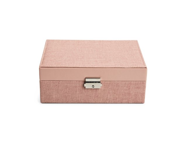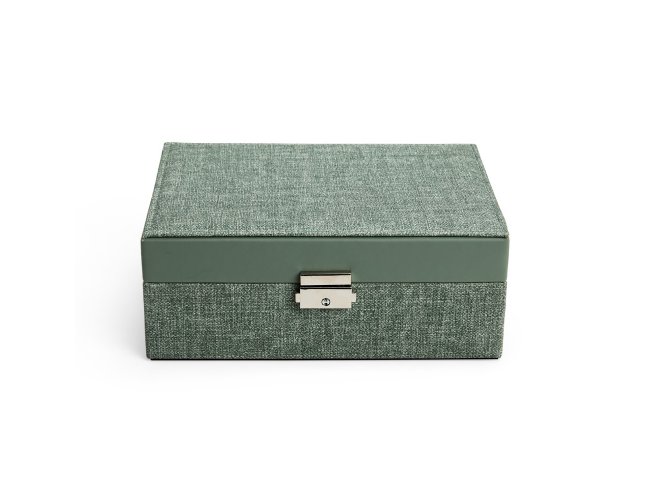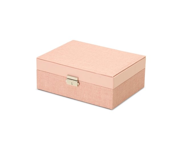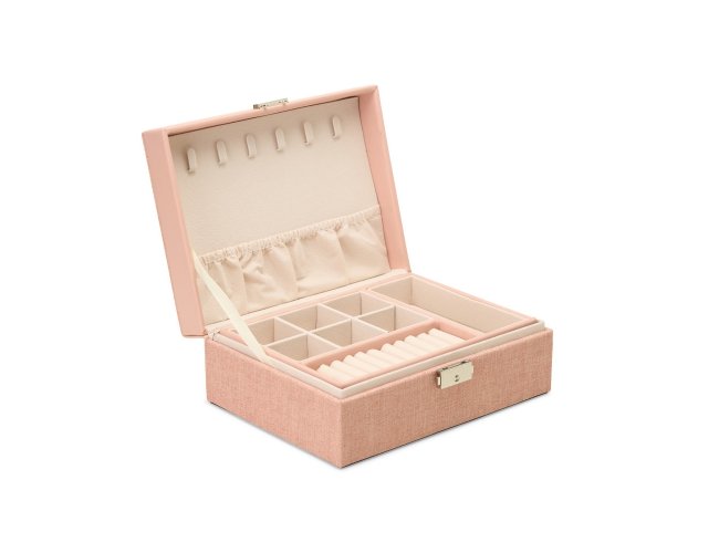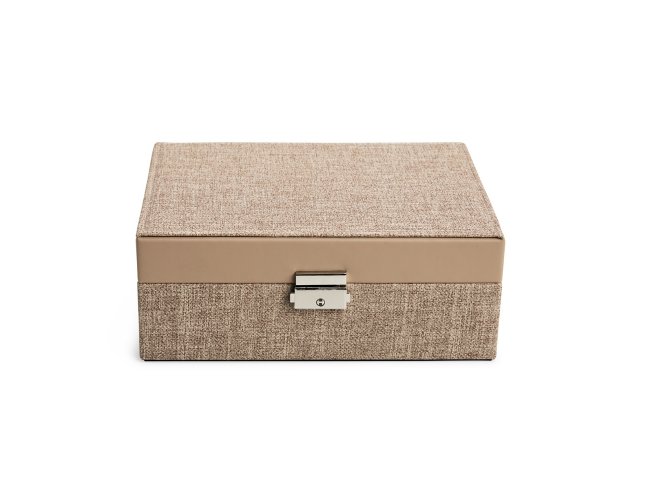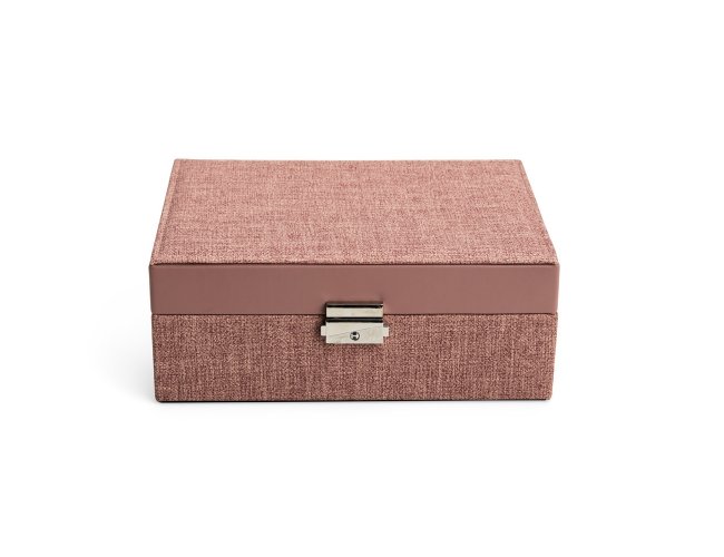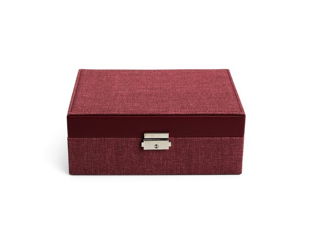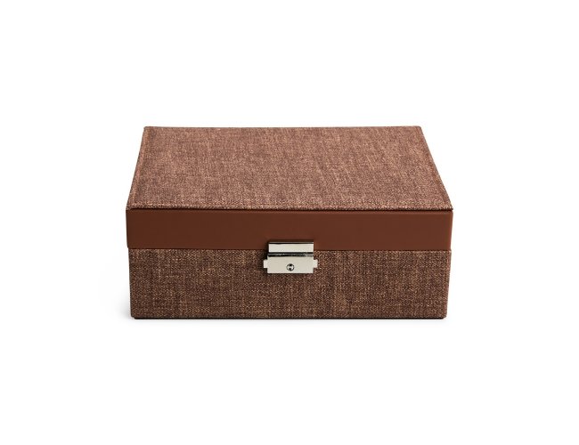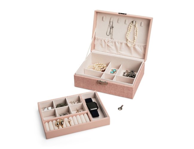 Porta-joias em Poliuretano e revestimento interno em tecido aveludado. Apresenta dois compartimentos principais com divisórias em diferentes tamanhos, incluindo uma repartição almofadada com ranhuras. Conta ainda com seis ganchos e um bolso com elástico na parte interna da tampa. O estojo possui trava de segurança e chave para fechamento.