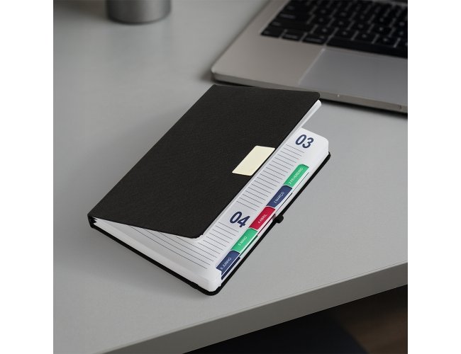 Agenda diária 2026 com capa em linho com detalhe em metal, marca-páginas feito em cetim, porta-canetas lateral e fechamento em elástico. Possui páginas para planejamento mensal, calendários de 2026 a 2028, além de listas de conversão de pesos e medidas, contatos e códigos DDI.