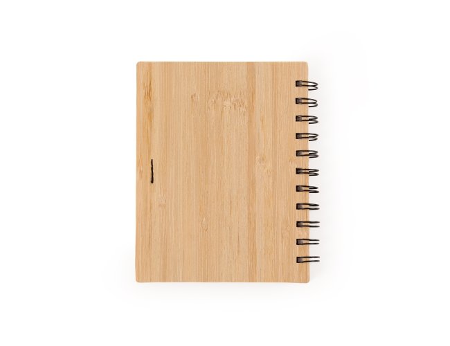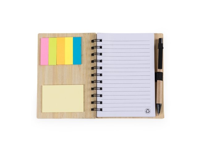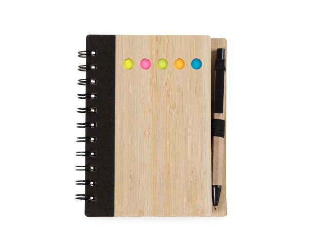 Bloco de anotações ecológico com caneta e autoadesivos. Capa de bambu com uma faixa preta no lado esquerdo e verso liso. Possui cinco blocos autoadesivos coloridos com aproximadamente 20 folhas cada, 70 folhas aproximadamente brancas pautadas com logo reciclado na lateral inferior. Acompanha suporte elástico de nylon com uma caneta de papelão com acessórios plásticos.