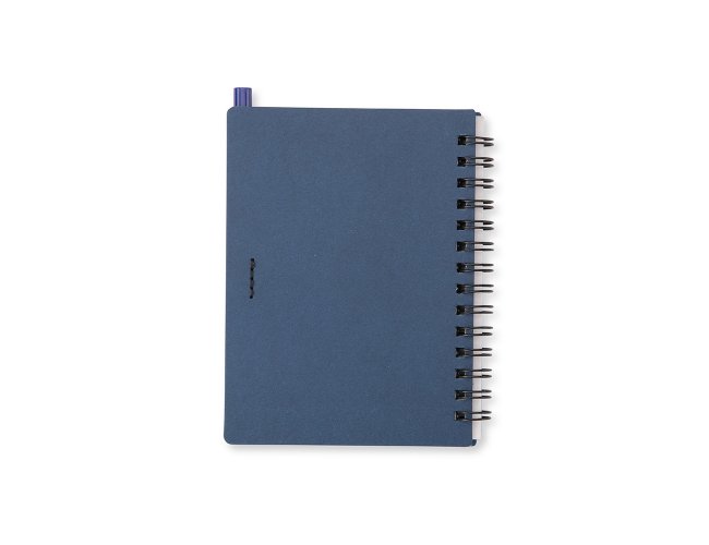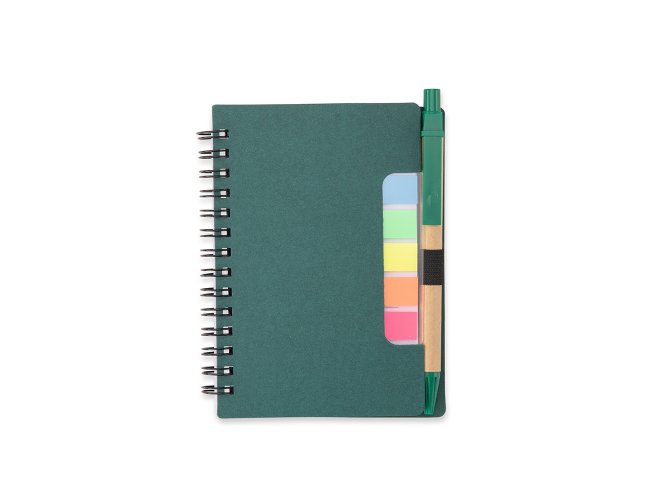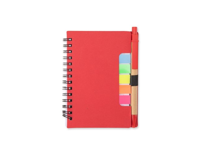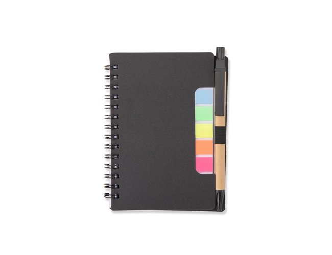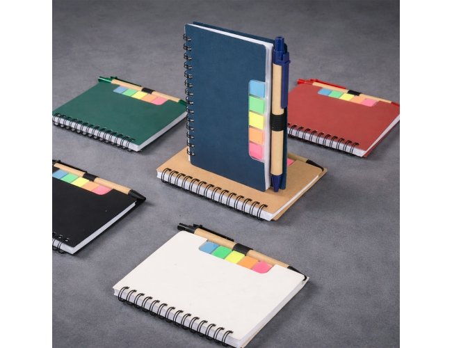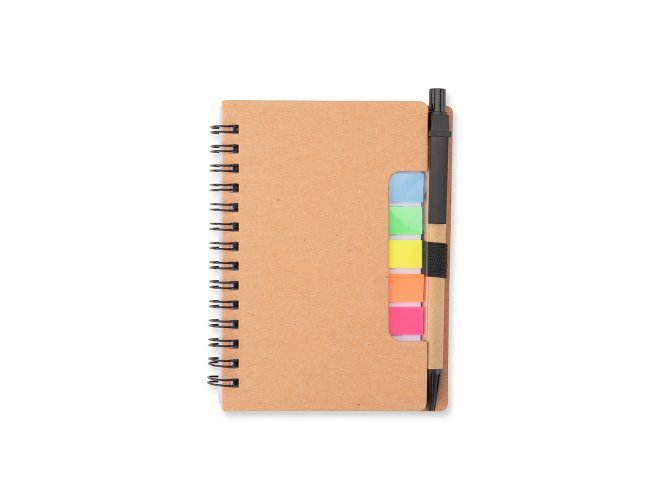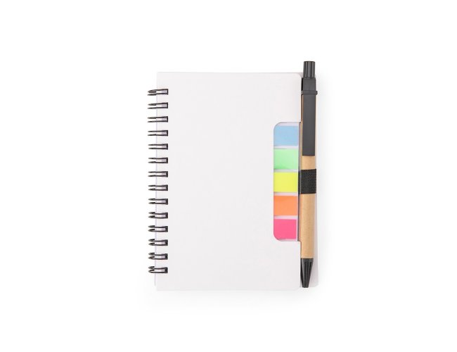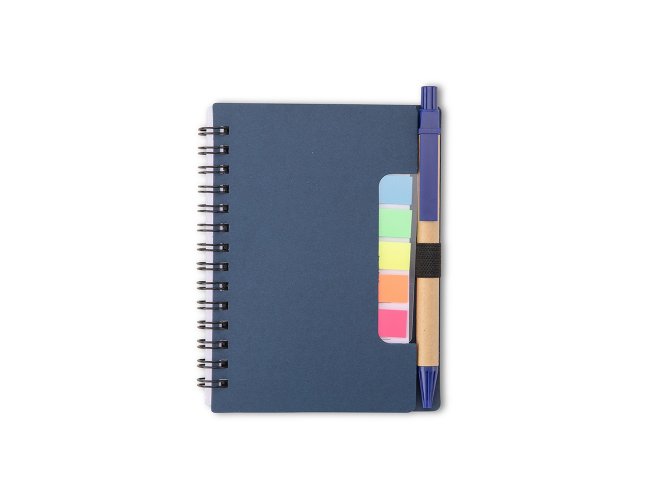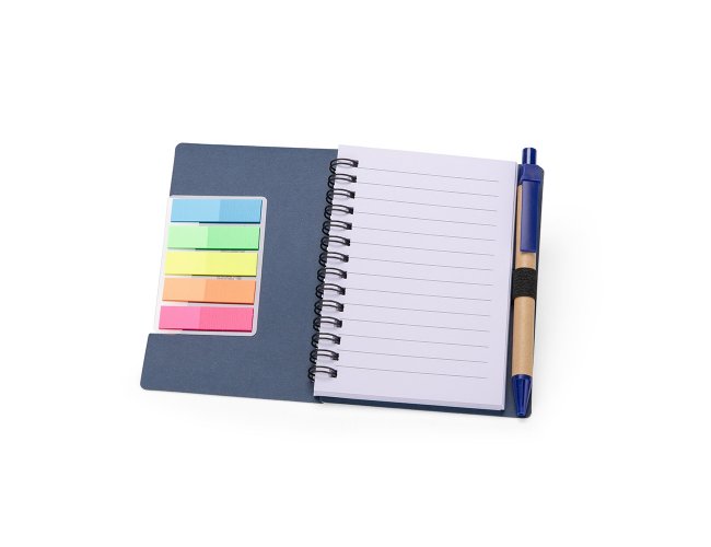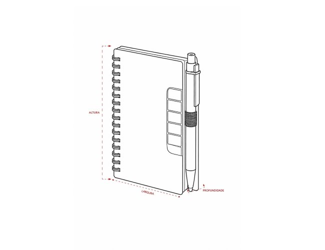 Bloco de anotações com autoadesivos e caneta de papelão. Possui capa dura revestida em papel especial, cinco blocos autoadesivos com 20 folhas cada e um bloco com aproximadamente 72 folhas brancas pautadas. Conta com suporte de nylon para a caneta e acompanha caneta de papelão com detalhes em plástico, carga esferográfica na cor azul e acionamento por clique.