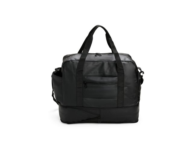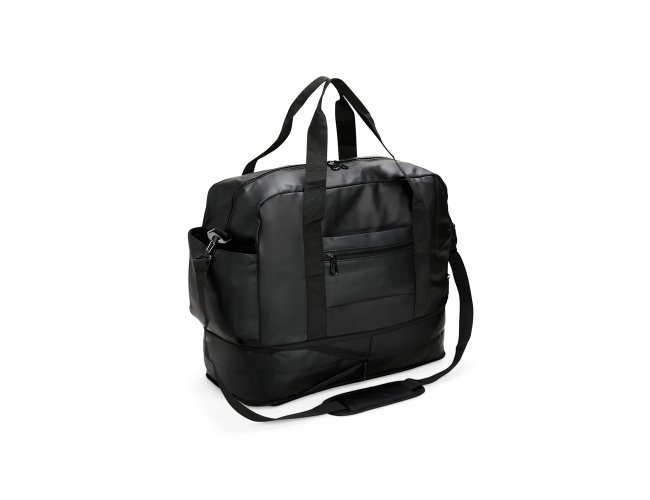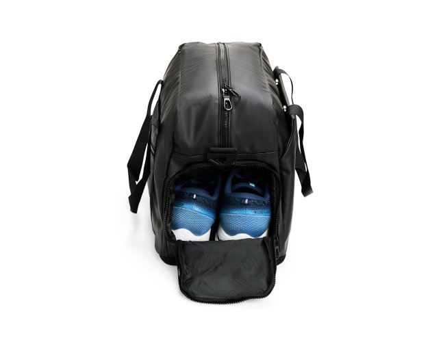 Bolsa em filme sintético tipo couro impermeável, com até 44 litros de capacidade após expansão inferior. Possui compartimento interno com bolso menor e outros quatro externos: um com botão magnético, um para calçados, um aberto e outro com zíper e encaixe para malas. Possui um par de alças laterais de mão e uma alça transversal removível.