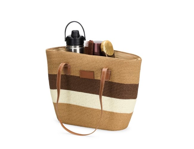Bolsa em fibra biodegradável de celulose costurada com linha de nylon e fechamento em zíper. Possui compartimento interno com bolso compacto, além de alças e detalhes em couro sintético, incluindo plaquinha frontal costurada.