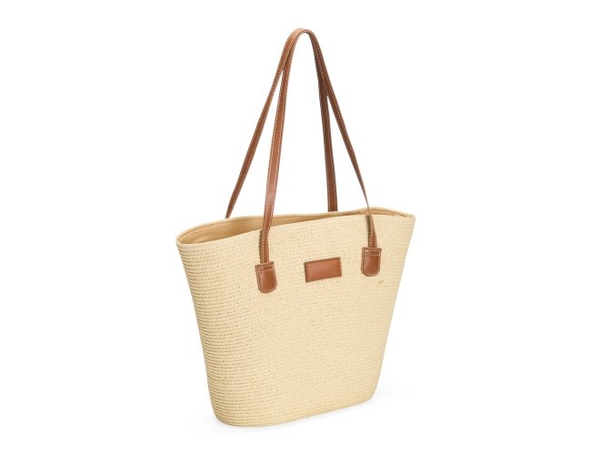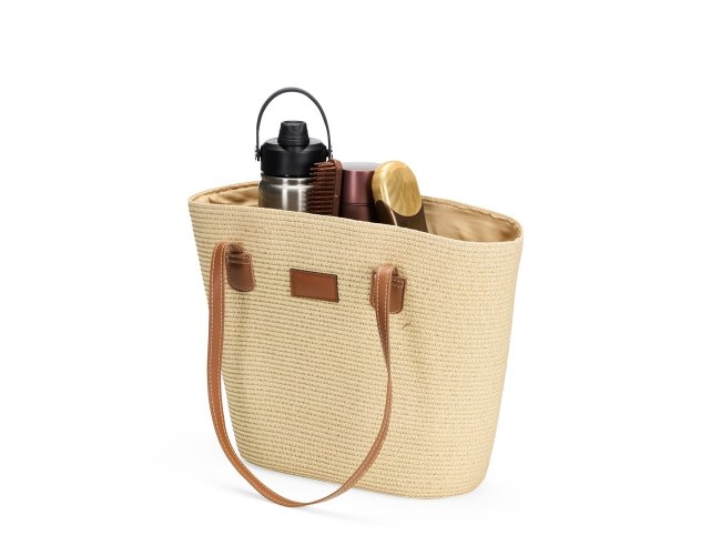 Bolsa em fibra biodegradável de celulose costurada com linha de nylon e fechamento em zíper. Possui compartimento interno com bolso compacto, além de alças e detalhes em couro sintético, incluindo plaquinha frontal costurada.