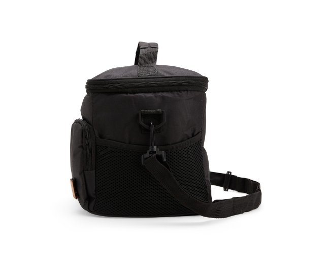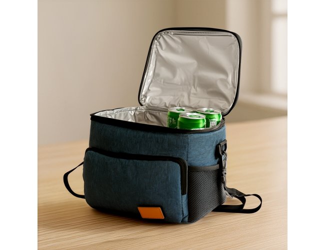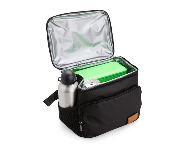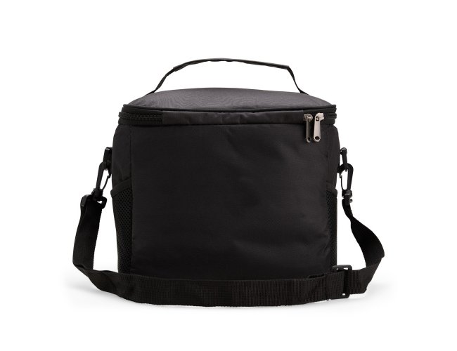 Bolsa térmica confeccionada em Oxford resistente à água, fechamento em zíper, alça de nylon na tampa e capacidade de até 11 litros. Possui revestimento térmico em PEVA atóxico, além de compartimento frontal com plaquinha de couro sintético fixada por velcro e dois bolsos laterais em tela de tecido respirável com elástico. Acompanha alça transversal removível e ajustável.