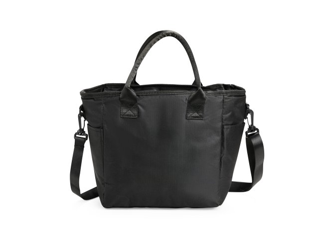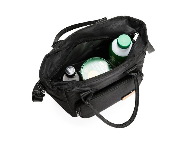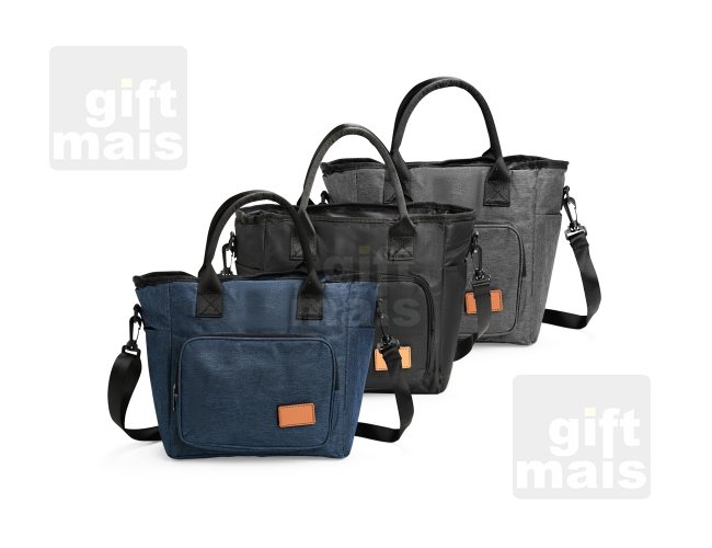 Bolsa térmica com capacidade de até 13 litros. Confeccionada em Oxford resistente à água, possui compartimento interno com revestimento térmico em PEVA e fechamento em zíper. Conta ainda com bolso frontal com plaquinha de couro sintético fixada com velcro, um par de bolsos laterais e duas alças fixas para transporte, além de uma alça transversal regulável com mosquetões para encaixe nas fivelas laterais da bolsa.