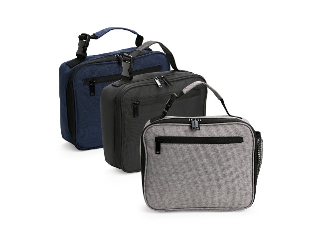 Bolsa térmica em poliéster impermeável com fechamento em zíper e capacidade de até 6 litros. Possui revestimento térmico interno em PEVA atóxico e compartimento em tela de nylon. Apresenta bolso frontal com zíper e bolso telado com elástico, além de alça de mão com engate rápido.
