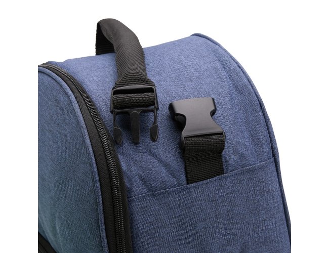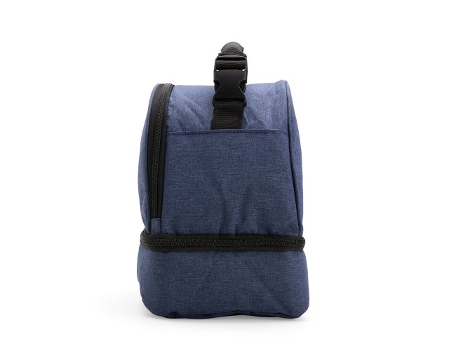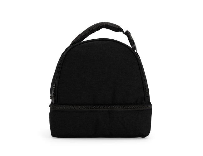Bolsa térmica dupla feita em poliéster 300D resistente à água, com capacidade total de 12 litros divididos em dois compartimentos revestidos internamente em PEVA: o superior comporta até 5 litros e o inferior, até 3 litros. Possui alça superior com engate em plástico.