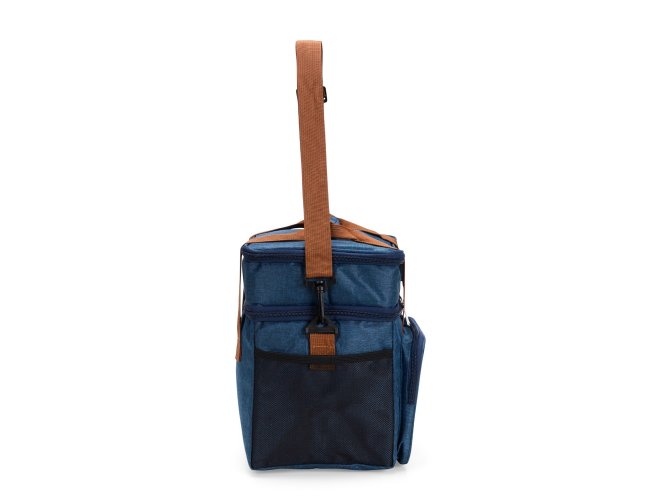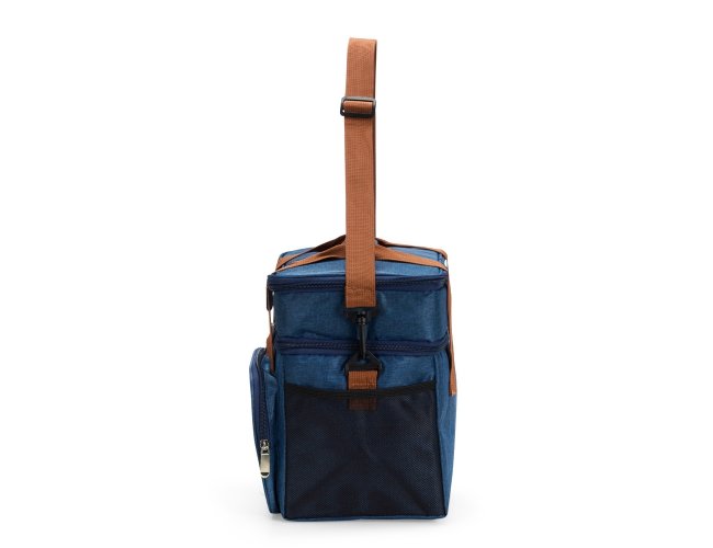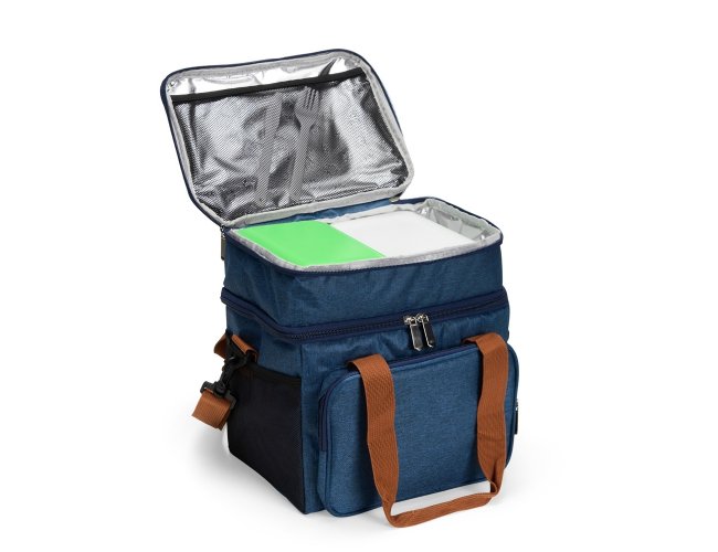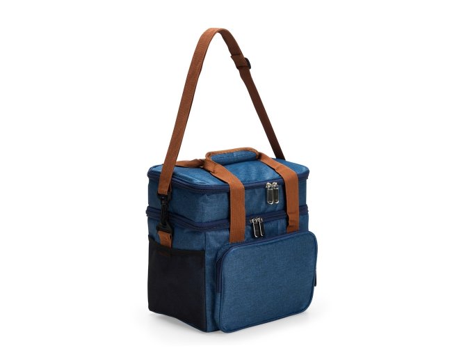 Bolsa térmica dupla em poliéster 300D resistente à água e capacidade total de 15 litros. Possui dois compartimentos térmicos: um inferior, com revestimento em PEVA soldado (não vaza) que comporta até 11 litros e outro, em alumínio, com espaço para até 3 litros. Conta ainda com bolso frontal de 1 litro, bolsos laterais em tela, alças de mão com suporte de juntura e alça transversal regulável e removível.