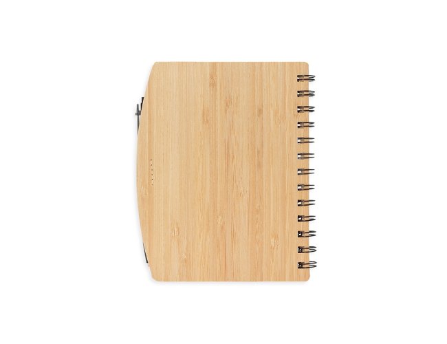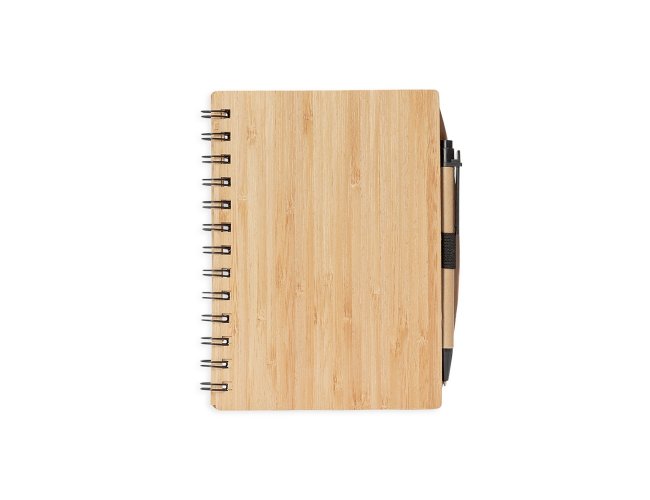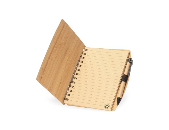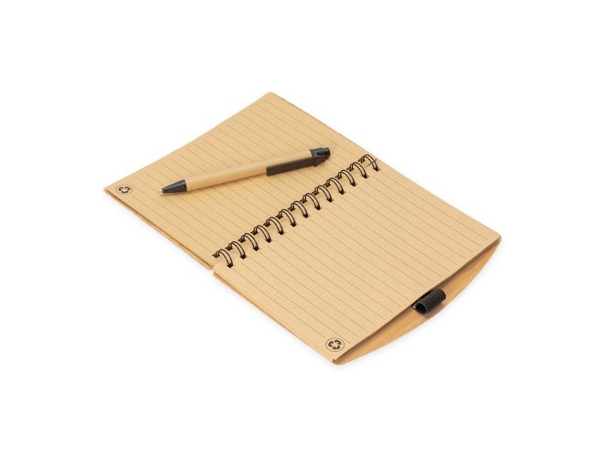 Caderno ecológico com capa dura em papelão texturizado que remete ao bambu, encadernação em Wire-O e suporte elástico para caneta. Contém aproximadamente 60 folhas beges pautadas, com símbolo de reciclagem na lateral inferior. Acompanha uma caneta esferográfica de carga azul de 1,0mm com corpo em papelão e clip, acionamento por clique e ponteira em plástico.