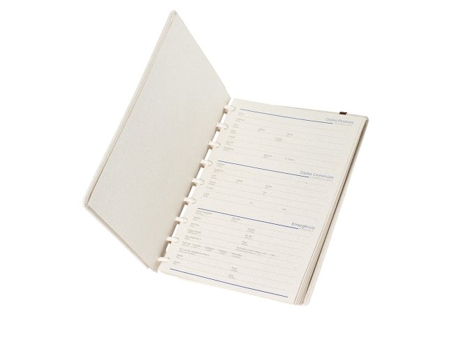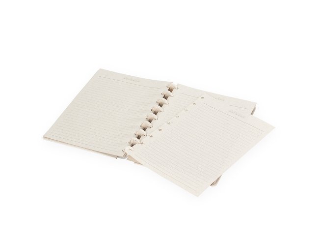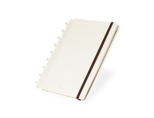 Caderno de capa dura em papel reciclado, com fechamento em elástico e encadernação em discos de fibra de arroz, que permitem adicionar ou retirar folhas compatíveis. Possui páginas dedicadas para dados pessoais, calendários de 2025 e 2026 e um manual para troca e retirada de folhas. Possui cerca de 80 folhas em papel reciclado pautadas.