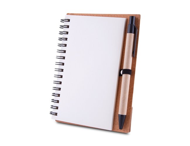 Caderno de capa dura em papelão com encadernação Wire-O e porta-canetas em elástico. Possui cerca de 70 folhas sem pauta, além de 25 folhas autoadesivas amarelas e quatro blocos de marcadores de página coloridos, com cerca de 25 unidades cada. Acompanha caneta esferográfica com carga azul de 1.0mm, acionamento por clique, corpo em papelão e demais componentes em plástico.