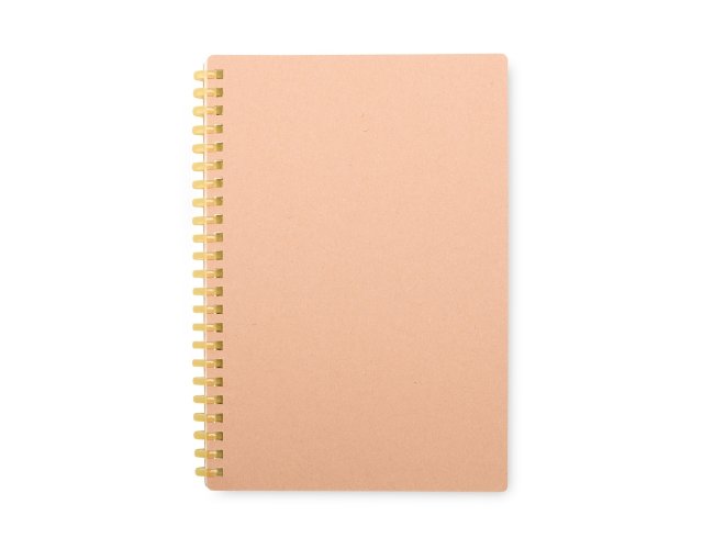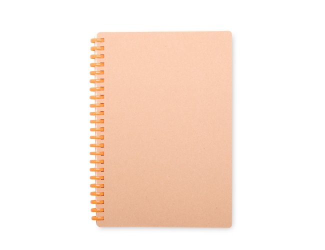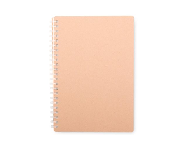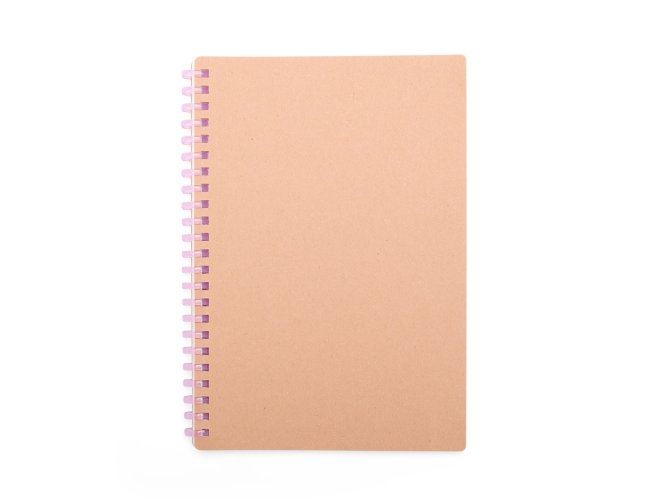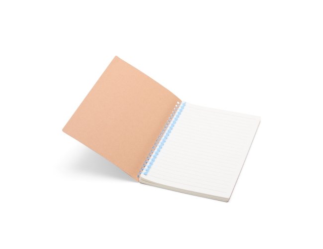 Caderno com capa em kraft com encadernação em espiral de plástico. Possui cerca de 80 folhas com pautas.