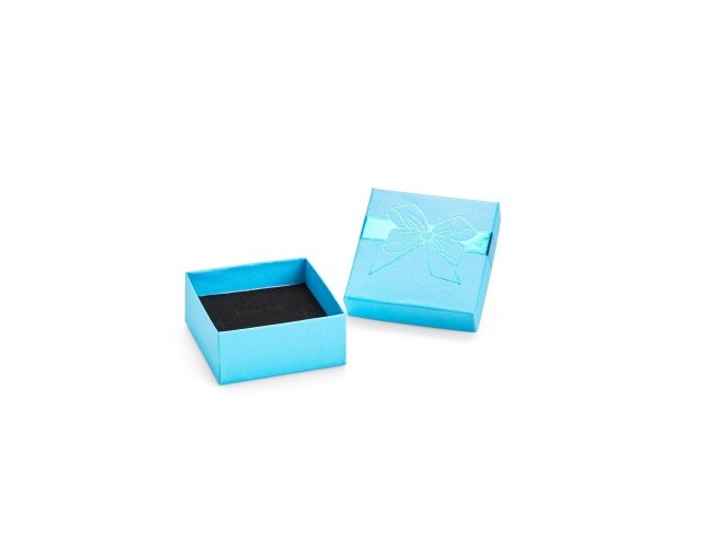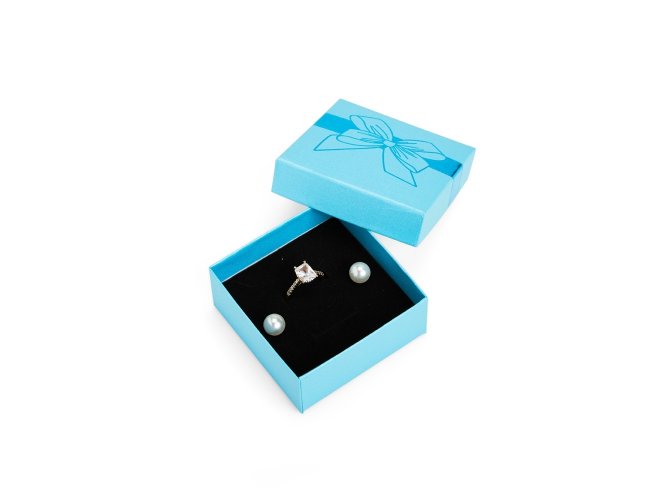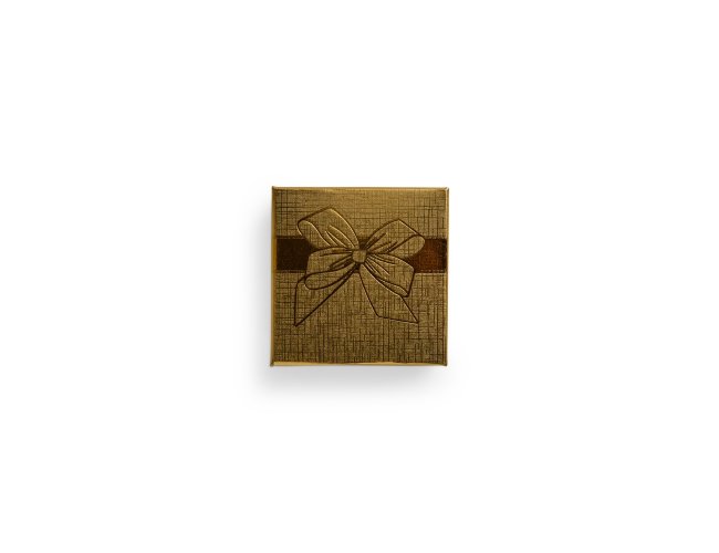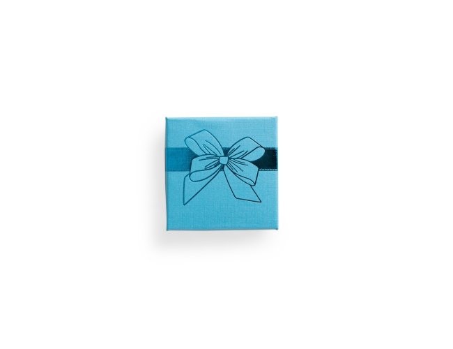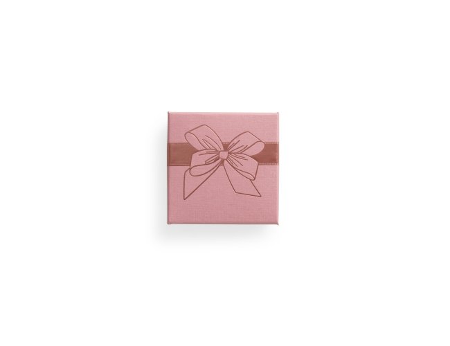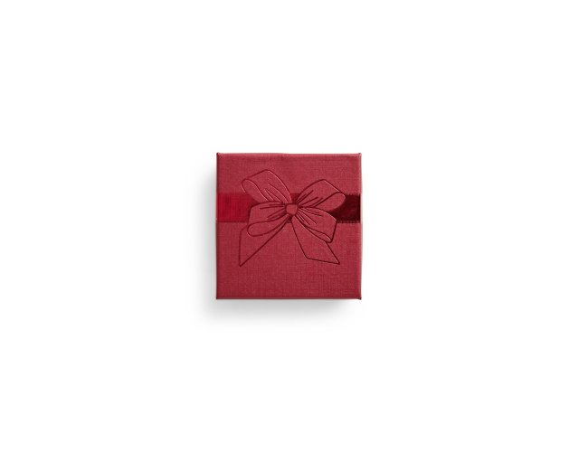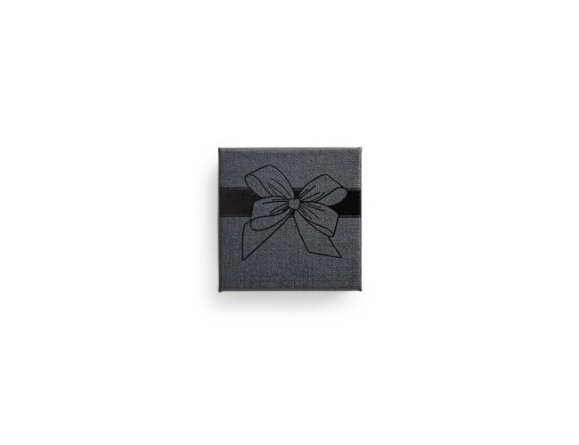 Caixa para presente compacta em papelão com acabamento levemente texturizado e ilustração de laço na tampa. Acompanha berço removível em espuma com ranhuras.