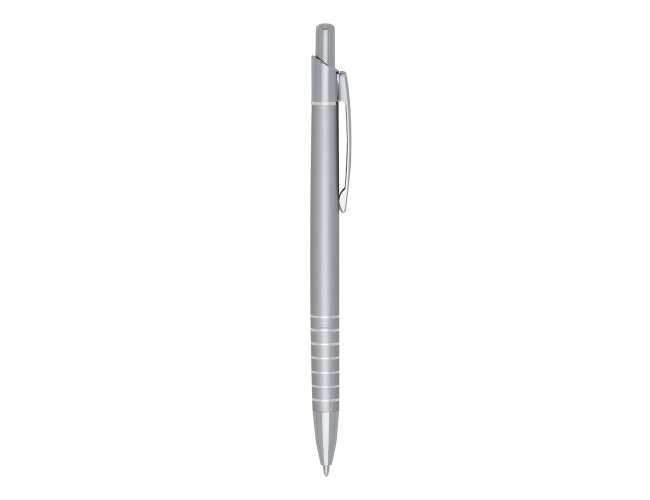 Caneta metálica com carga esferográfica azul e acionamento por clique.