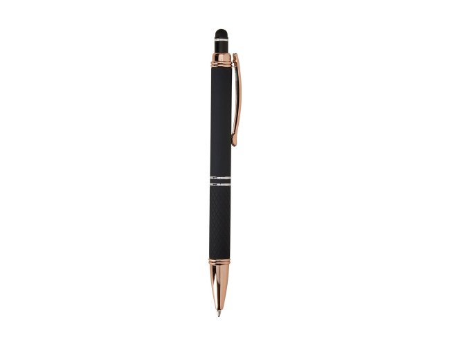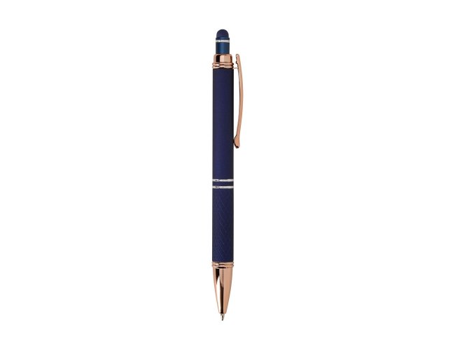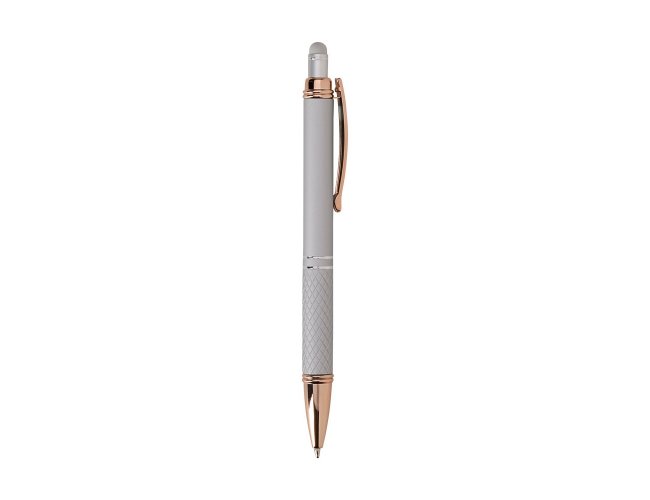 Descrição: Caneta metálica com detalhes texturizados próximos à ponta, carga esferográfica azul de 1.0mm e acionamento por clique com acabamento emborrachado, ideal para usar como uma caneta touch para interação com dispositivos de tela sensível ao toque.