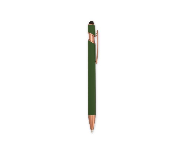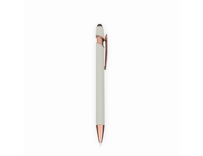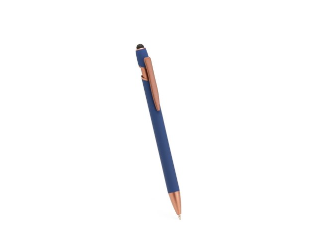 Caneta metálica com pintura de acabamento emborrachado e acionamento por clique. Conta com topo emborrachado para uso em dispositivos com telas sensíveis ao toque, além de carga esferográfica azul de 1,0 mm.