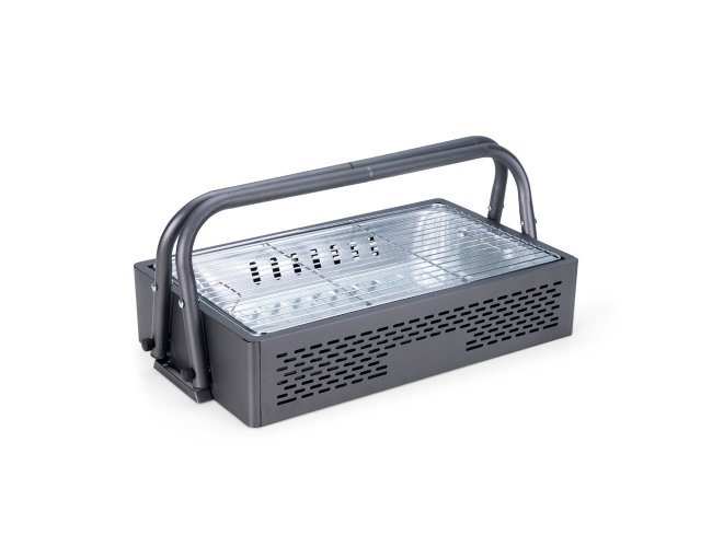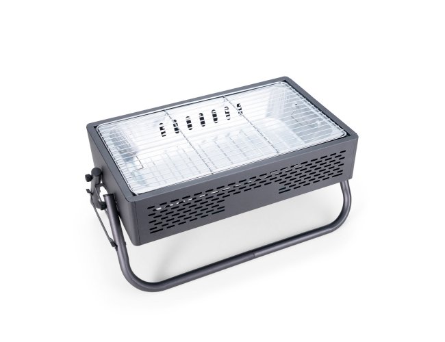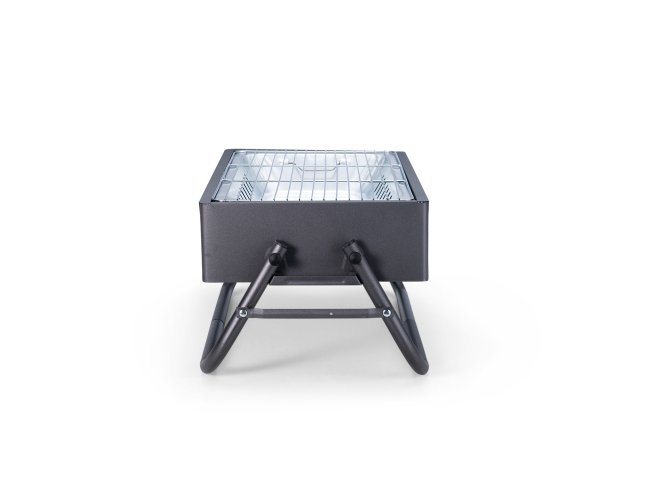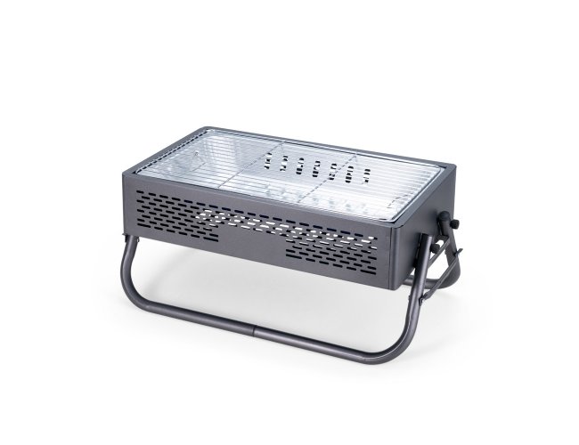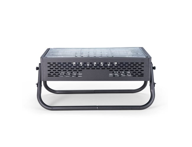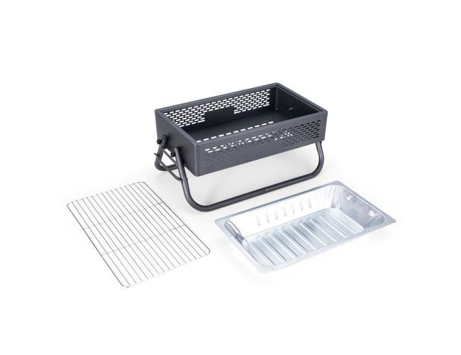 Churrasqueira em ferro com aberturas para ventilação e pés montáveis, que também podem ser utilizados como alças para transporte quando a churrasqueira não estiver em uso. Conta ainda com grelha em metal galvanizado e bandeja metálica com alças removíveis para acomodação do carvão.