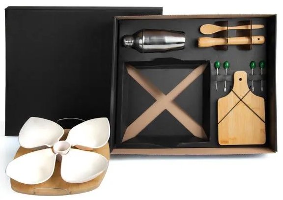 Conjunto para caipirinha com petisqueira, coqueteleira, tábua e utensílios