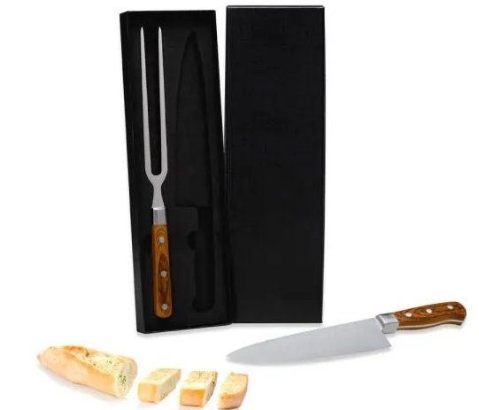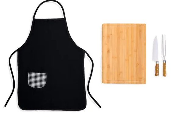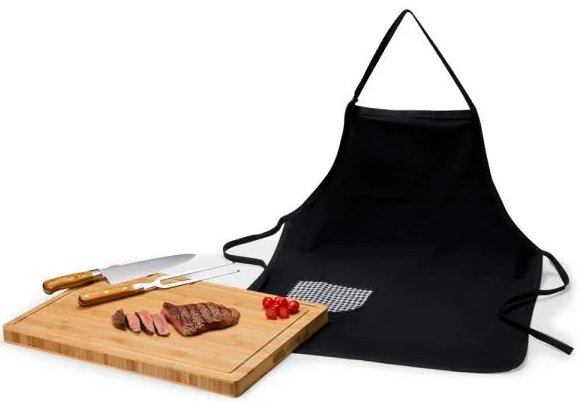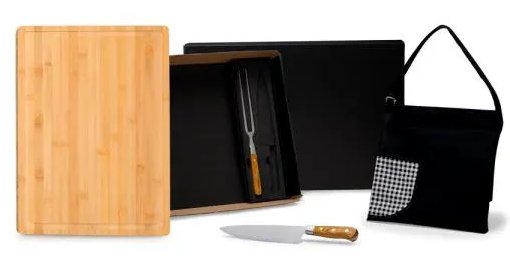 Conjunto para Churrasco. Composto por tábua em Bambu para Churrasco; faca e garfo premium em Madeira / Inox. Conta também com avental Gourmet em Brim preto.
