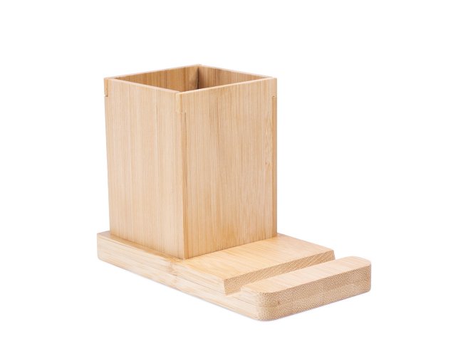 Conjunto de mesa em bambu, ideal para organizar o seu espaço de trabalho. Composto por 1 canaleta para suporte do seu celular e um copo, desmontável, para organizar as suas esferográficas e outros materiais de trabalho. Fornecido em caixa presente de papel kraft reciclado. A cor e o resultado da impressão nos materiais naturais pode variar entre produtos. Dimensões montado: 80 x 145 x 104 mm | Caixa: 80 x 145 x 33 mm