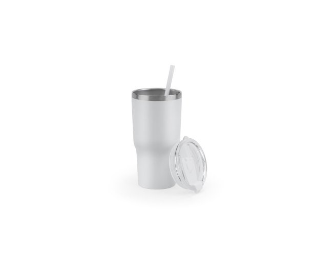 Copo de viagem compacto e de fácil utilização para as suas viagens e atividades ao ar livre. Composto por aço inox 91% reciclado, com parede dupla isolada a vácuo e acabamento mate. Este copo pode ser utilizado de duas maneiras: através da sua abertura para palhinha ou do orifício para utilização direta (pode ser fechado). Capacidade até 600 mL. Fornecido em caixa presente de papel kraft reciclado. Certificação EU Food Grade. ø86 x 168 mm (sem canudo) | Canudo: 205 mm