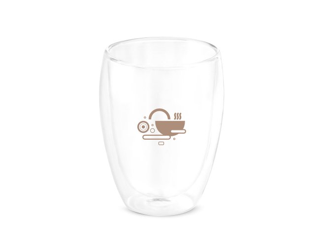 Copo em vidro borossilicato com parede dupla, isolada a ar. Capacidade até 350 mL. Fornecido em caixa presente personalizável. Certificação EU Food Grade. ø87 x 113 mm | Caixa: 95 x 95 x 125 mm
