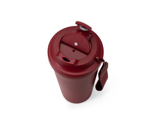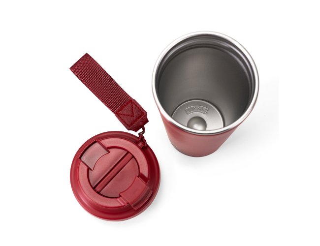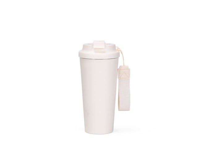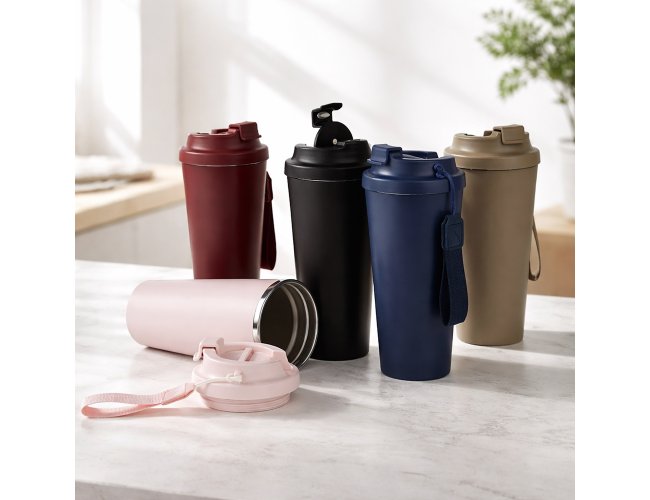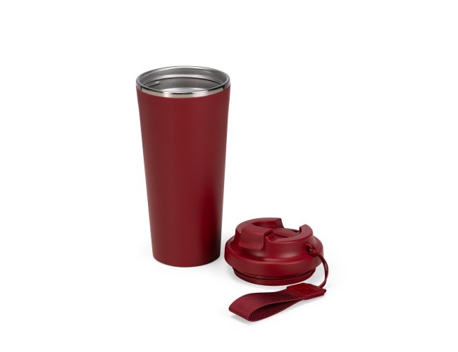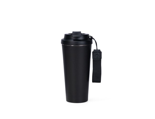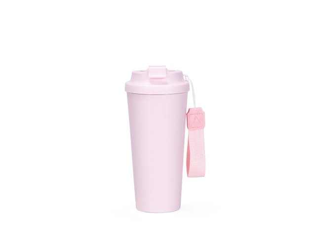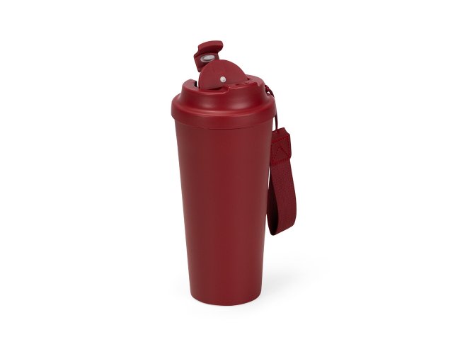 Copo em inox 304 com revestimento externo em polipropileno (PP) e capacidade para até 480ml. Apresenta tampa rosqueável em PP livre de BPA com protetor para o bocal. Acompanha alça em nylon com detalhe em couro sintético para transporte.