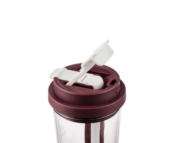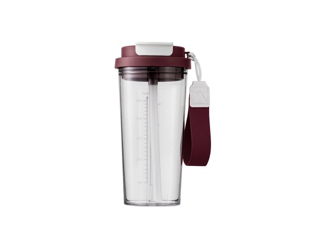 Copo em plástico livre de BPA com capacidade para até 600ml. Possui marcação de volume impressa e tampa rosqueável com trava de segurança para o bocal, além de bico flip com protetor próprio. Acompanha canudo para encaixe interno e alça de nylon com detalhe em couro sintético.