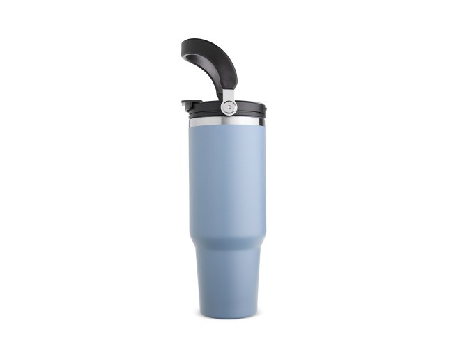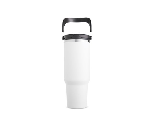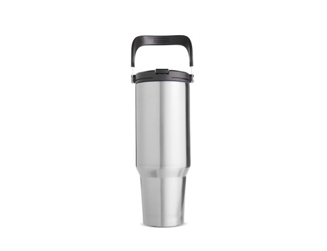Copo térmico em inox com capacidade de até 1,25 litro. Possui estrutura de parede dupla e tampa plástica rosqueável com vedação a vácuo, o que permite conservar a temperatura de líquidos por mais tempo. Conta ainda com alça para transporte em inox com revestimento em plástico e canudo plástico removível.