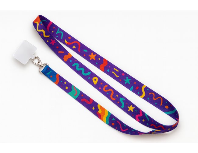 Cordão com alça para celular feito em poliéster. O acessório é fixado a um cartão retangular que se encaixa na parte interna da capa do celular, próximo à entrada de carregamento USB.