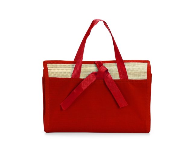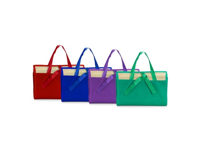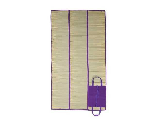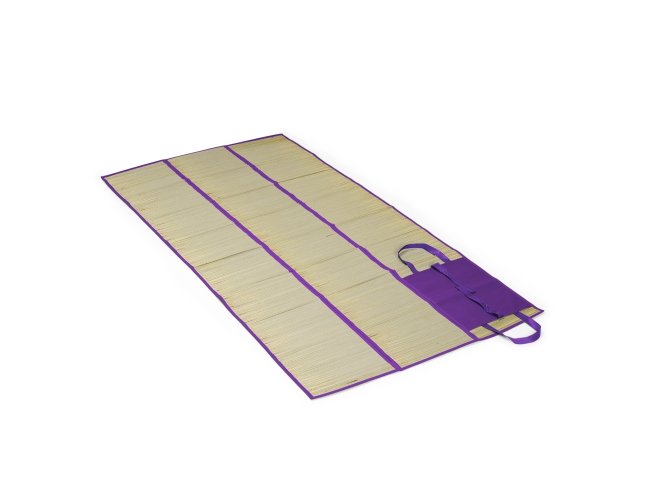 Esteira dobrável em palha sintética com bordas costuradas em nylon dividindo a esteira em três partes. Além disso, possui um par de alças costuradas para transporte.