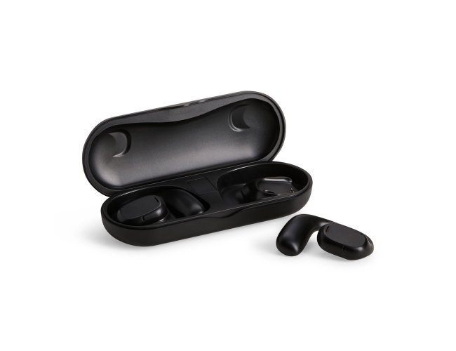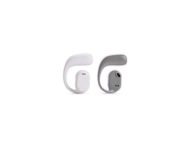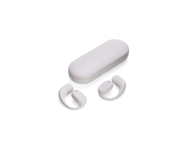 Fones de ouvido sem fio com estrutura em plástico. Possuem formato aberto e ergonômico, permitindo o encaixe nas orelhas sem entrar em contato direto com o canal auditivo. Possuem microfone interno para chamadas pelo celular ou WhatsApp. Apresentam conexão via Bluetooth 5.3 que oferece uma transmissão de dados mais estável e com maior qualidade. Acompanha estojo de carregamento com visor de percentual da carga total, além de cabo USB-C para recarga.