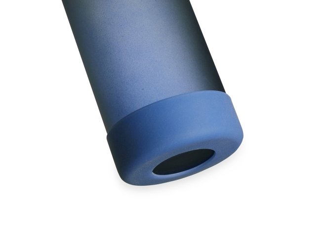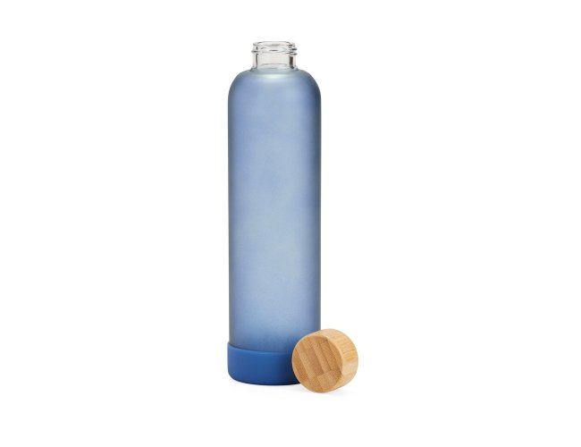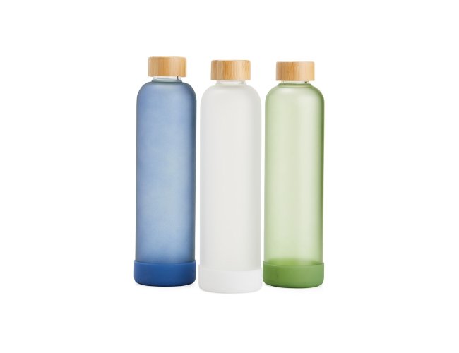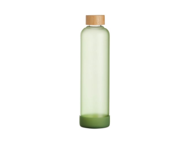 Garrafa em vidro borossilicato com capacidade de 1 litro. Conta com uma tampa rosqueável de bambu e protetor anti-impacto removível em silicone.