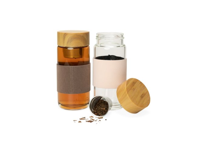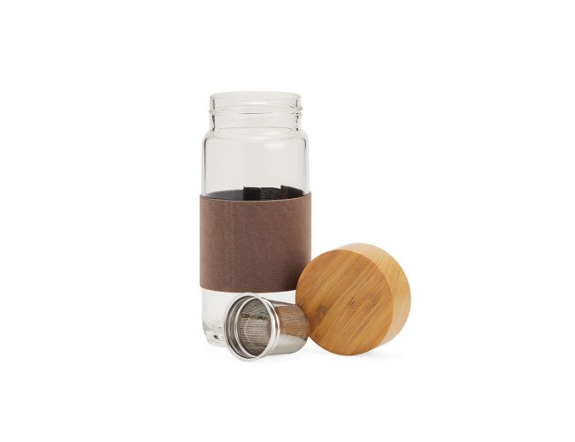 Garrafa de vidro borossilicato com capacidade de 400ml, acompanha infusor e luva de tecido sintético. Tampa plástico com design de bambu.
