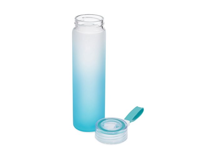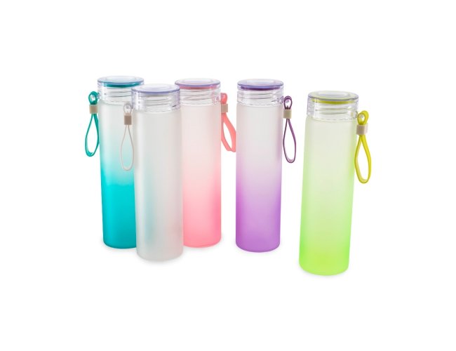 Garrafa de vidro jateado bicolor, capacidade de 470ml. Contém alça de silicone.
