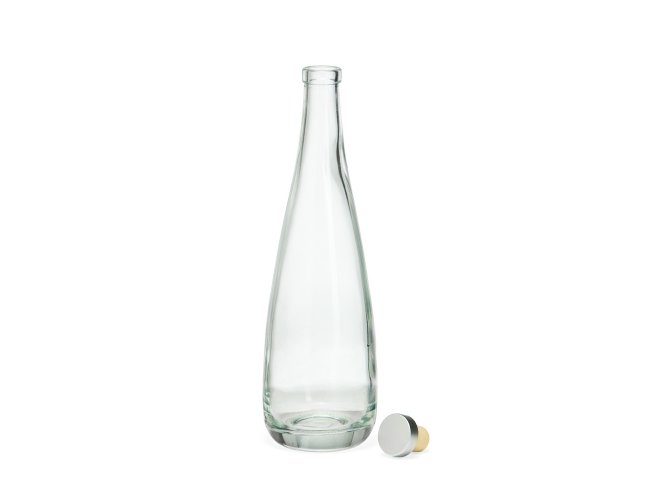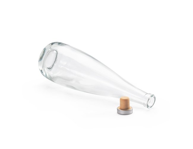 Garrafa de vidro com tampa rolha em material sintético e capacidade máxima de até 550ml.