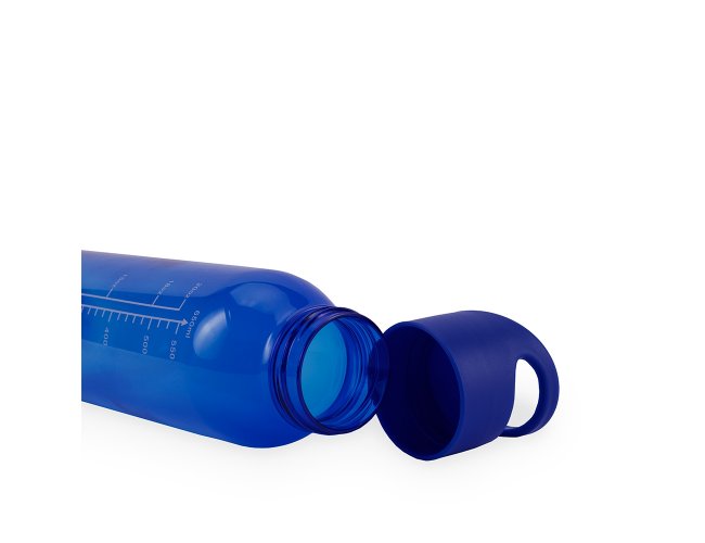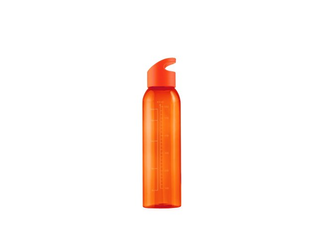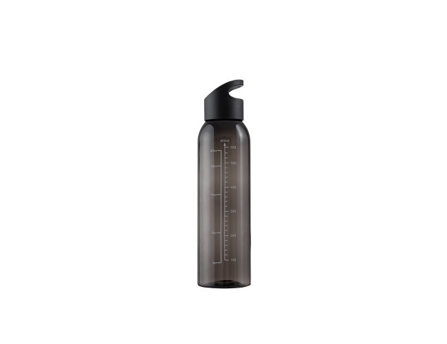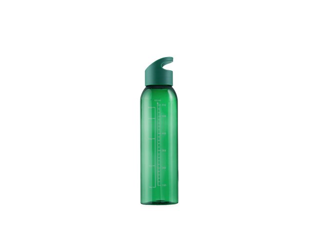 Garrafa feita em plástico livre de BPA com capacidade máxima de 700ml e marcação de volume impressa para até 650ml. Possui tampa rosqueável com alça fixa para facilitar o transporte.