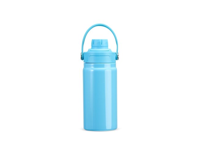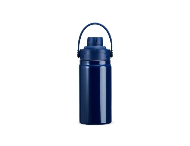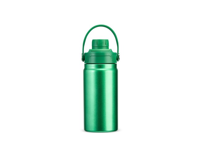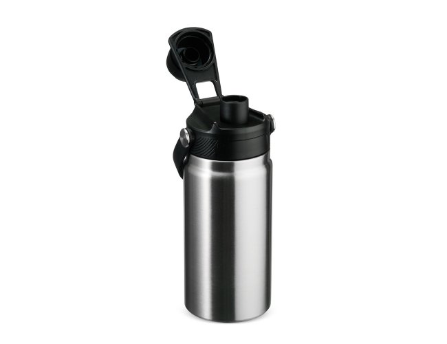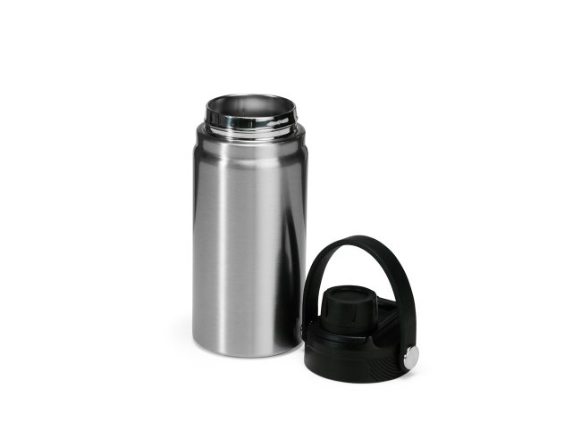 Garrafa térmica em inox com capacidade para até 400ml. Apresenta estrutura de parede dupla e vedação a vácuo, que mantém a temperatura de líquidos por mais tempo sem transferência para o exterior. Possui tampa plástica rosqueável com protetor de o bocal e alça fixa para transporte.