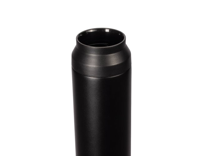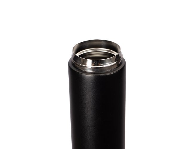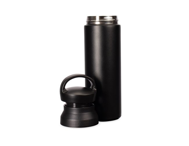 Garrafa térmica com capacidade de até 500ml. Conta com estrutura de parede dupla e isolamento a vácuo, o que permite a conservação da temperatura de bebidas por mais tempo. Possui tampa plástica rosqueável com alça para transporte e abertura em duas camadas.