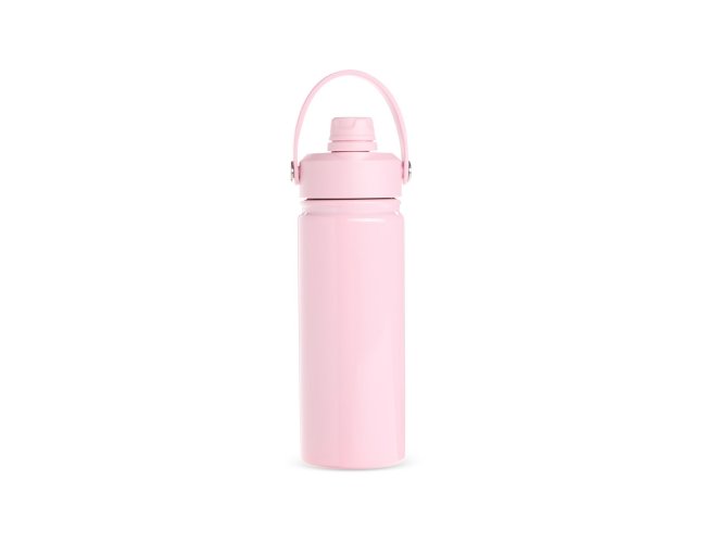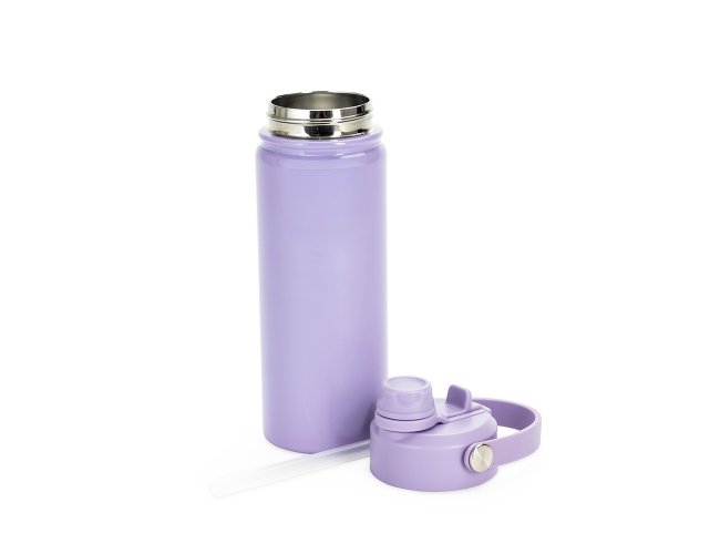 Garrafa térmica em aço inox 304 e capacidade para até 600ml. Apresenta estrutura de parede dupla e vedação a vácuo, oferecendo a conservação da temperatura de líquidos por mais tempo. Possui tampa rosqueável feita em plástico com proteção para o bocal, bico flip, canudo interno removível e alça fixa para transporte.