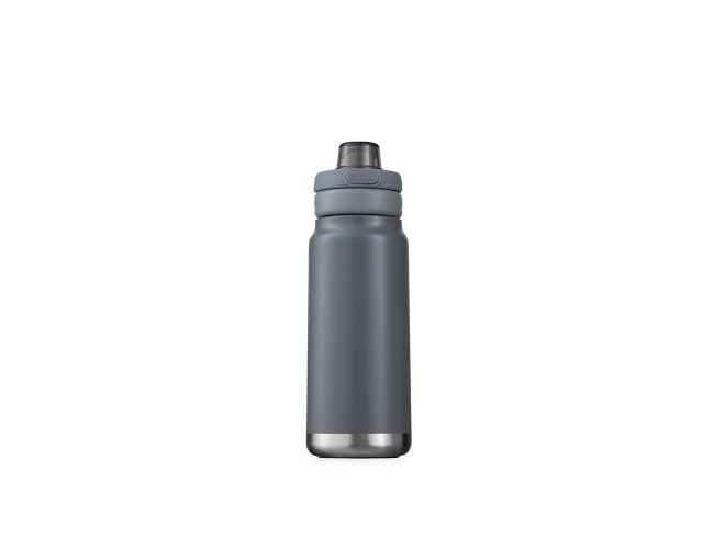 Garrafa térmica em inox com base emborrachada antiderrapante e capacidade máxima de 750ml. Possui estrutura de parede dupla e isolamento a vácuo, permitindo conservar a temperatura de líquidos por mais tempo. Dispõe ainda de tampa plástica com alça móvel e protetor para o bocal acionado por botão. Acompanha um canudo plástico para encaixe no interior da garrafa.