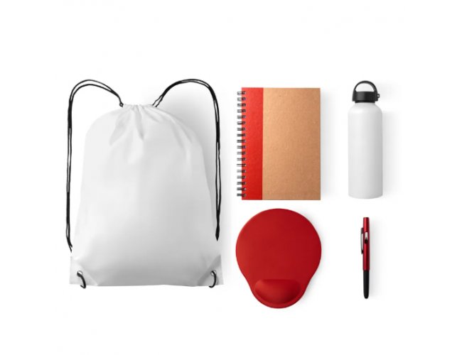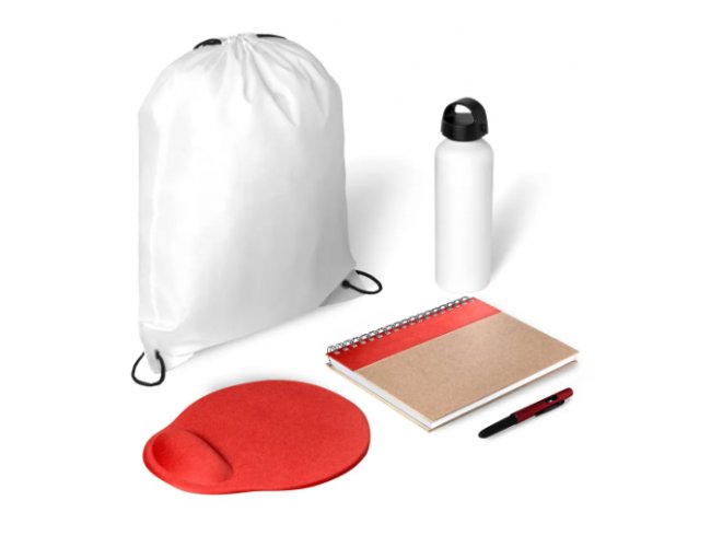 Composto por mochila sacola branca em Nylon 190D com alças ajustáveis; garrafa em alumínio branco com tampa plástica rosqueável preta com alça; mouse pad vemelho ergonômico com apoio de espuma para o punho; caderno para anotações wire-o com capa dura bege/vermelho e caneta esferográfica em ABS vermelho.