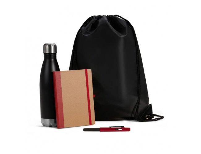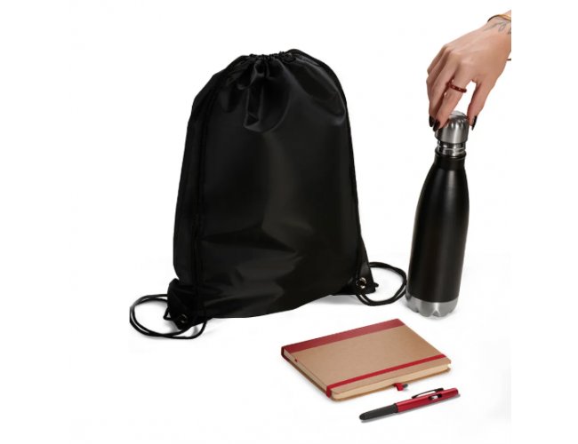 Sugestão de Personalização: Uma gravação a Laser na garrafa; uma gravação em Silk/Digital na mochila, caderno e caneta.