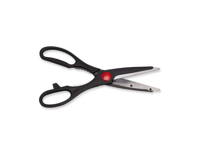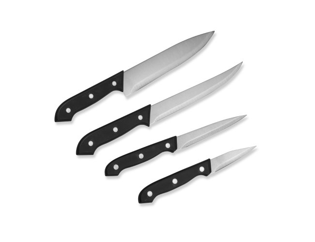 Kit churrasco composto por 6 peças. O conjunto apresenta uma tábua em madeira de pinho, uma tesoura multiuso com estrutura em polipropileno e lâminas em inox e quatro facas com cabo em PP e lâminas em inox em diferentes tamanhos: 3, 4, 6 e 8 polegadas.