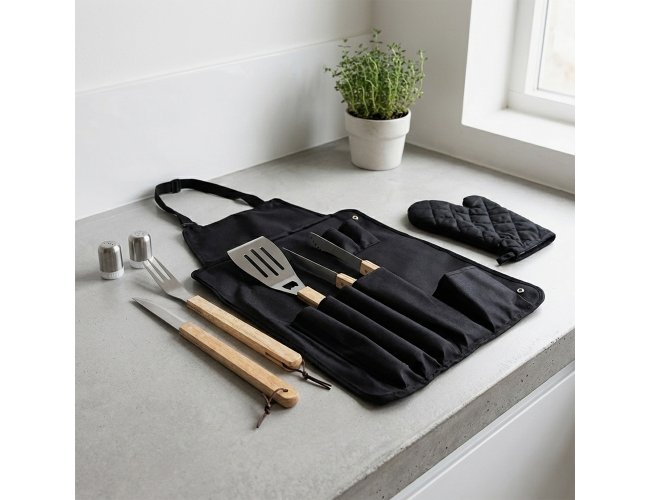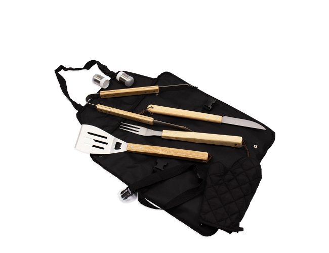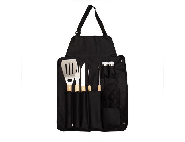 Kit churrasco 8 peças em estojo de nylon. Contém espátula, garfo, faca, pegador, saleiro, paliteiro, luva e avental (também utilizado como estojo). Talheres de inox com acabamento de madeira e avental de nylon com alça ajustável – possui botão e alça com fivela para lacre.