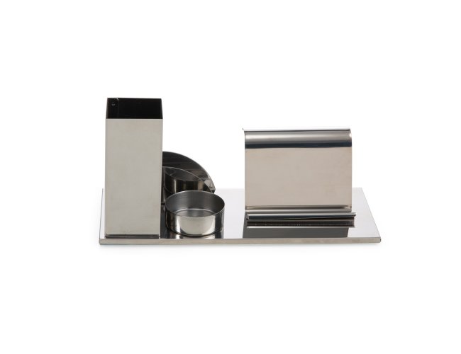Kit escritório 4 em 1 em inox espelhado. Possui suporte para canetas, cartões, clips e celular.