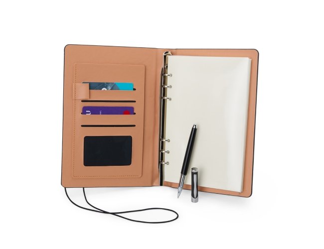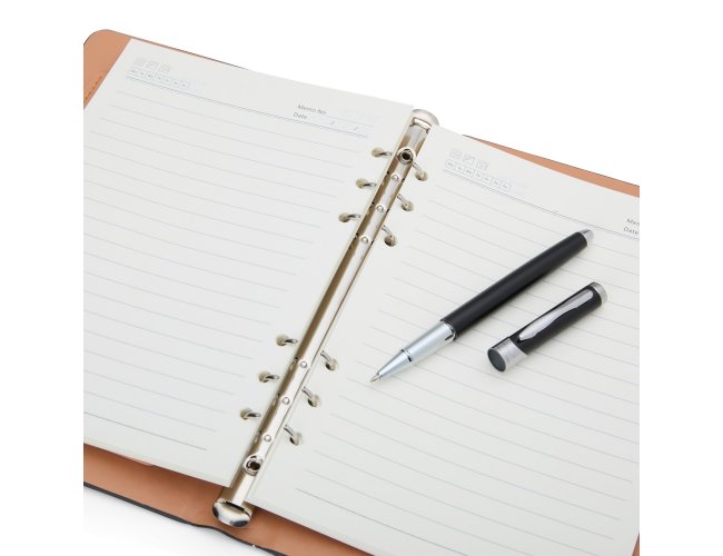 Anote tudo e organize os cartões com o nosso Kit Executivo! Ele vem com uma caneta metálica super sofisticada de 1.0mm na cor preta e um caderno fichário de aproximadamente 96 folhas removíveis, ou seja, dá para trocar, reorganizar e deixar tudo do seu jeito! Os seis anéis garantem praticidade, e a capa dura em couro sintético traz aquele toque elegante durante os registros e planejamentos. E tem mais! São quatro espaços para cartões, sendo um com visor transparente, espaço para guardar anotações, suporte para caneta e fechamento em elástico para manter tudo seguro. Para um toque exclusivo, ainda acompanha uma plaquinha para personalização e embalagem.
