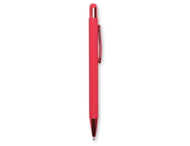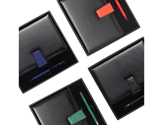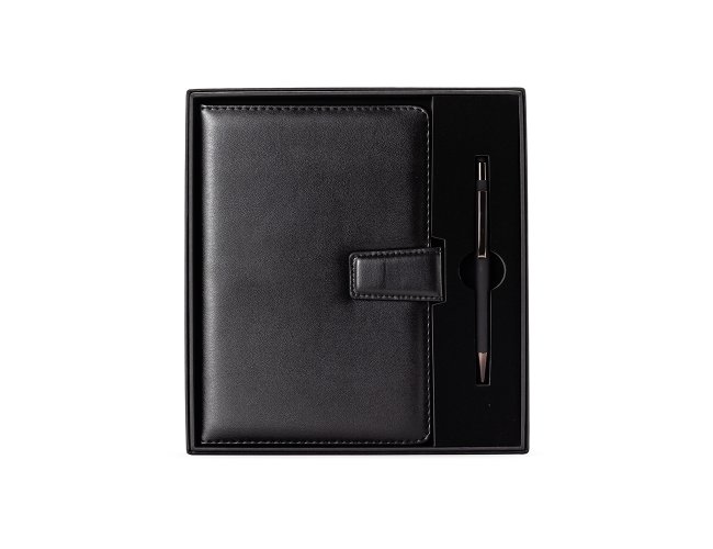 Kit executivo com duas peças, composto por uma caderneta de capa em couro sintético com fechamento magnético e cerca de 80 folhas pautadas, e uma caneta em metal com detalhes em plástico, ponteira emborrachada para uso em dispositivos touchscreen e carga esferográfica azul de 1,0 mm. Acompanha uma caixa de papelão com berço em espuma para a caneta.