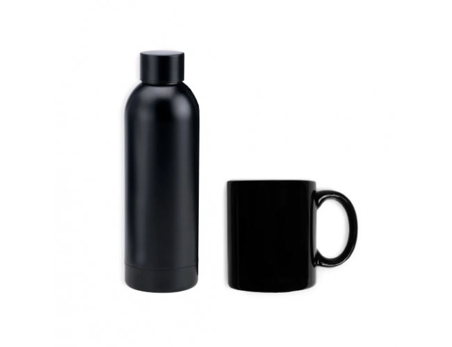Composto por garrafa em alumínio na cor branca com capacidade de 1 litro; caneca em cerâmica branca com capacidade de 230 ml e fone de ouvido Bluetooth.