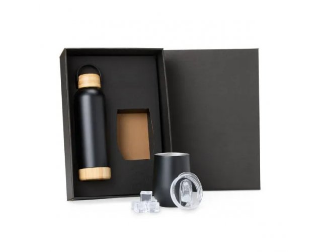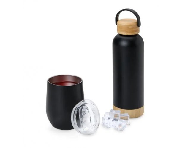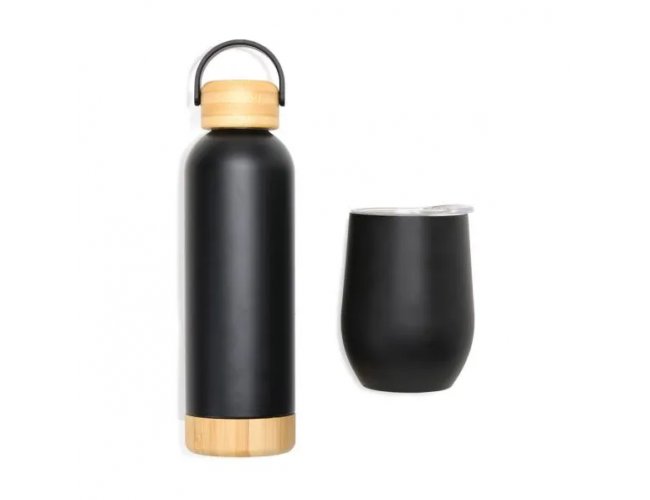 Kit garrafa e copo térmico. Composto por garrafa dupla camada em Inox na cor preta, confeccionada com detalhes em Bambu na tampa e na base, com capacidade de 500ml. Conta também com copo térmico com tampa 340ml, confeccionado com dupla parede de inox, isolada a vácuo.